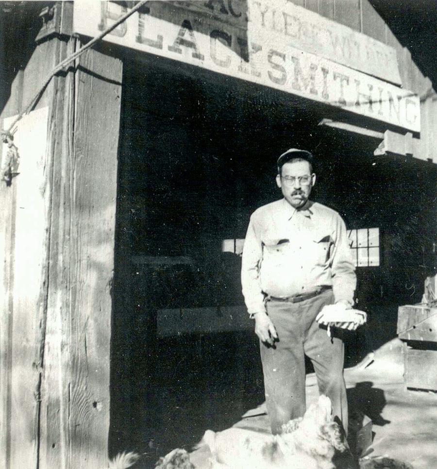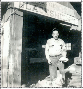 Here is a photo of Pete Mawson. He was the Blacksmith in Grimes for many decades. He was a Private in the Engineering Division during WWI. He was also a wonderful banjo picker and often played at dances in the Green Tree Saloon in the old Meat Market building. He always had a Riotan cigar in his mouth! The Blacksmith shop was located directly behind the Cook Market just down the street from the old bank building. He passed away in the living quarters of the shop in 1958.